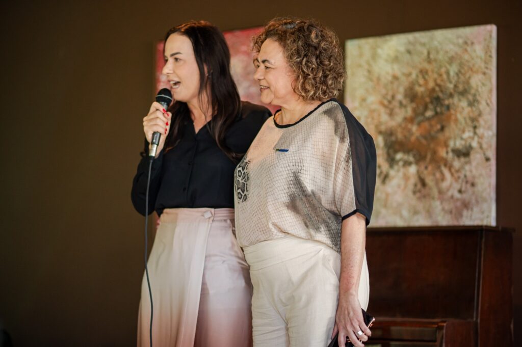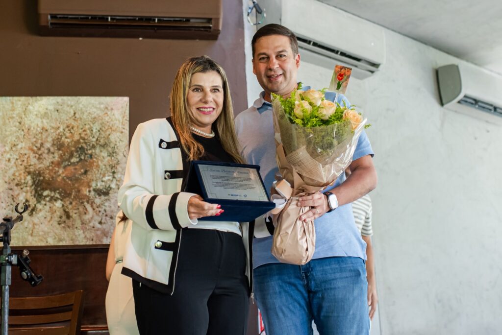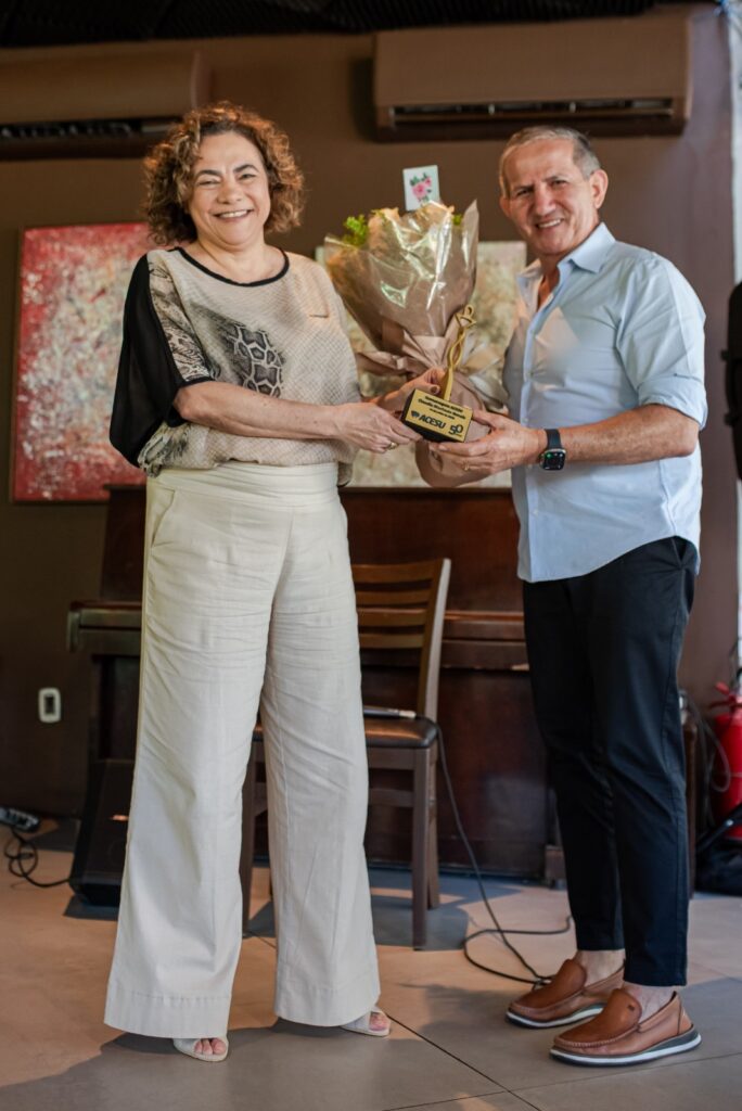 Encerrando o momento, a atual presidente Cláudia Novais recebeu um troféu comemorativo das mãos do ex-presidente Gerardo Albuquerque, em reconhecimento à sua gestão participativa e comprometida com a missão da Acesu.
