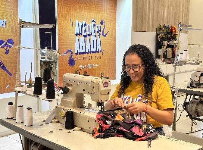 Costureiras de comunidades personalizam abadás para o Fortal em lojas sociais nos shoppings RioMar