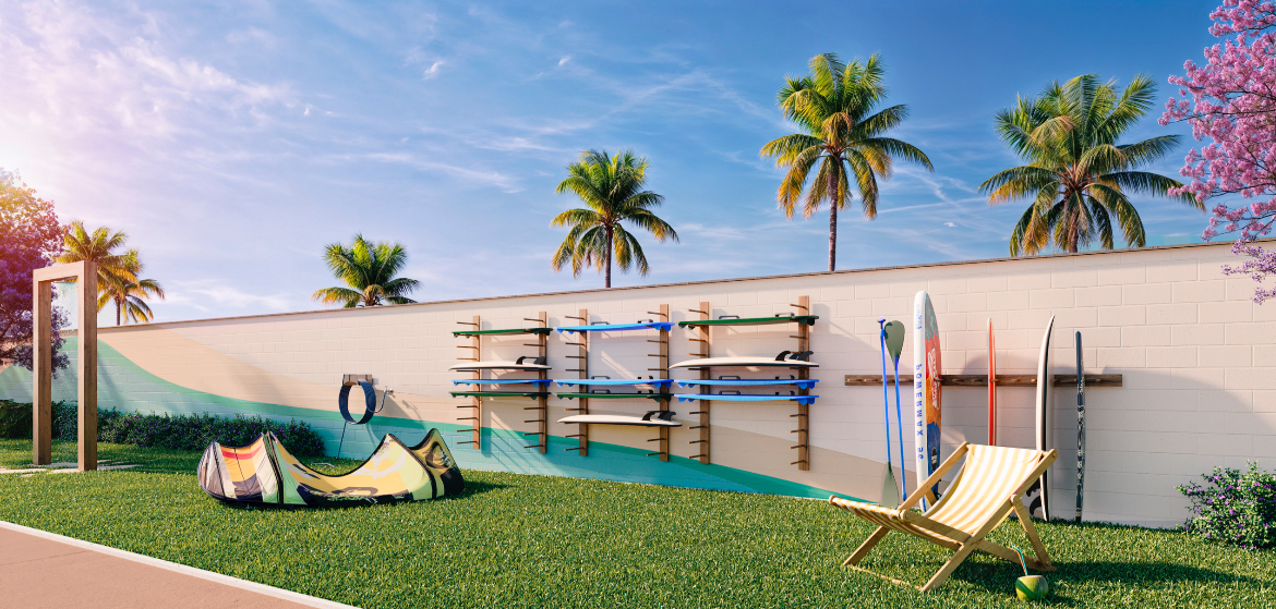 Outro diferencial do Vista Coqueiral está nos espaços pensados para o estilo de vida local: o projeto inclui guarderia exclusiva para equipamentos de kitesurf, com área de limpeza e secagem, além de coworking climatizado e protegido da maresia, permitindo que os moradores possam trabalhar com vista para o mar, sem abrir mão do conforto e da conectividade.